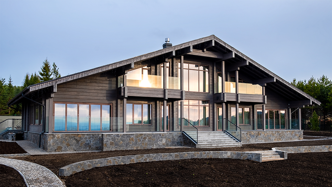 Изысканный стиль, сдержанная цветовая гамма и величественные масштабы резиденции идеально вписываются в природный ландшафт, не нарушая гармонии окружающей среды. Разнообразие используемых материалов подчеркивает удачный симбиоз современного дизайна и экологичного строительства: деревянный клееный брус, отделка цоколя камнем, обилие стекла.