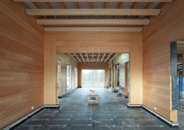 Строительство начинается с отбора качественной древесины и её точной обработки для защиты от внешних воздействий. Каркас собирается на прочных традиционных соединениях, где балки и стойки формируют основу будущего дома. После монтажа конструкции создаётся пространство: устанавливают стены, панорамное остекление и кровлю. Итог — монументальная, чистая и честная архитектура с открытой выразительной структурой.